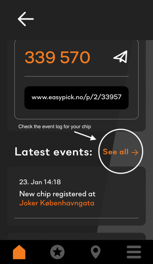 En annen funksjon som har blitt forbedret er vårt varslingssystem. Nå kan du skru på varslinger hvis din nøkkel med chip ikke har blitt levert til avtalt tid. Gå inn på chippen du ønsker varsling om, og trykk på bjelle-ikonet til høyre.